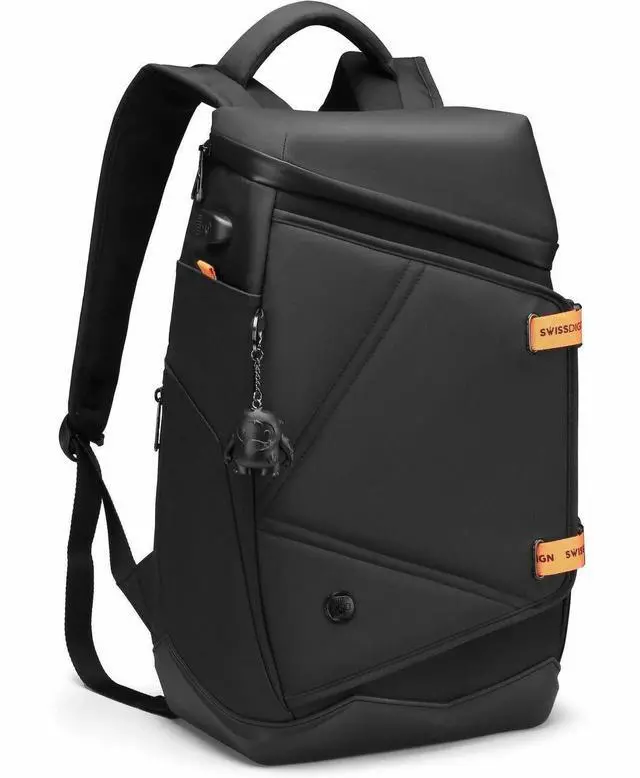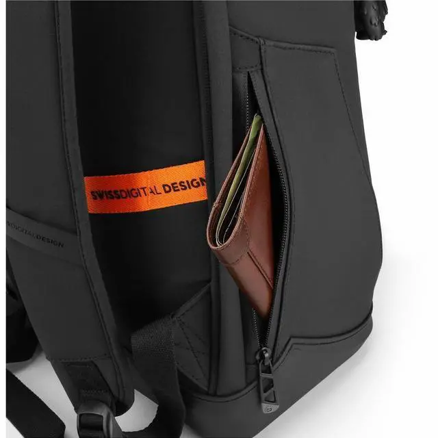 Swissdigital SEON Black L+ Backpack - USB Charging Port with Integrated Cable - RFID Protection - Eco-Friendly Fabric - Water-Resistant Bottom - Padded Laptop Compartment (Fits up to 16") SD1650-01
