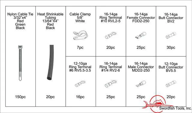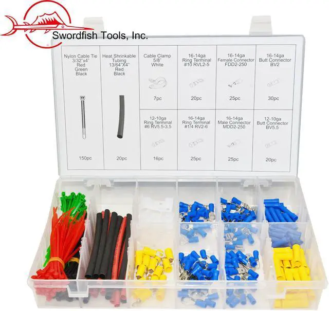 Assortment includes all the necessary connectors and terminals repair any 12/24V system. Includes heat shrink tubing for water resistant connections. Include nylon R clip. Include 3 color nylon cable ties