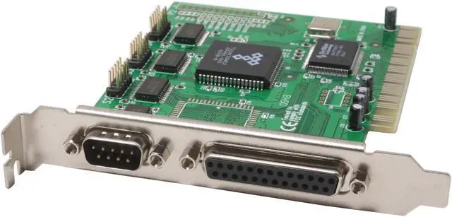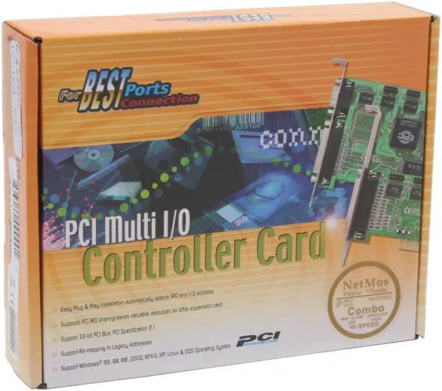 | Features | PCI to 4 Serial ports & 1 Parallel port controller card based on NM9755CV Plug & Play - Automatically selects IRQ and I/O address Supports PCI IRQ sharing Compatible with standard 16C550 UART with 16 byte transmit-receive FIFO SPP, PS2, EPP, ECP compatible IEEE 1284 printer port Built in 16 Byte FIFO |