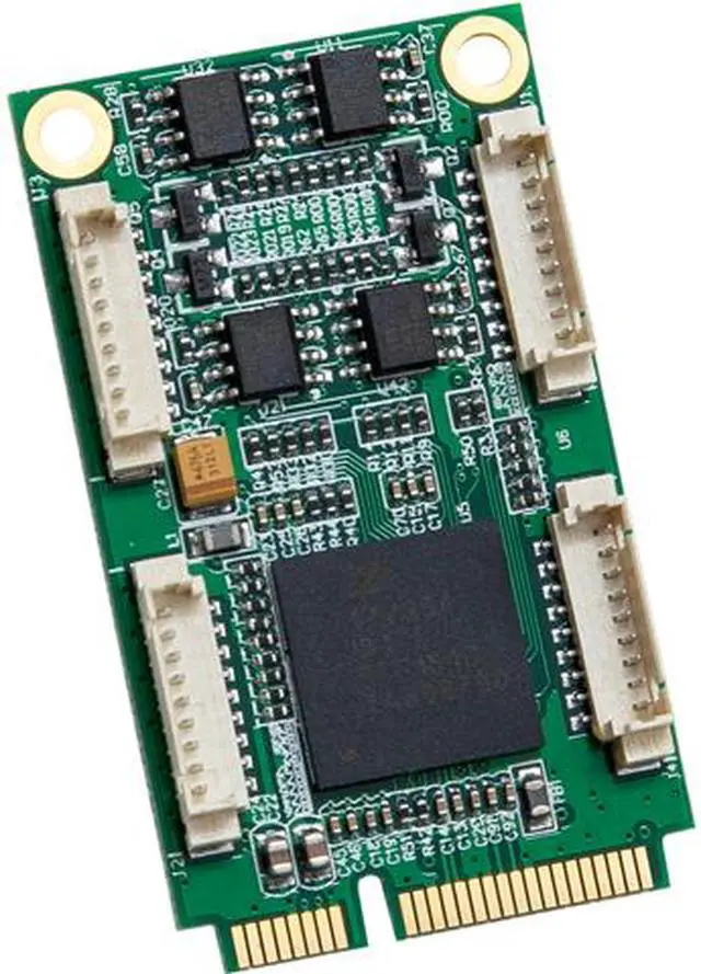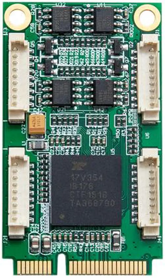| Features | Exar XR17V354 UART 16550 Chipset PCI-E Mini Card Revision 1.2 600W surge protection, 15KV ESD protection Support up to 32 RS-422 or RS-485 interfaces Sleep Mode with Wake Up Indicator Transmission Media: Twisted-pair or shielded-cable |