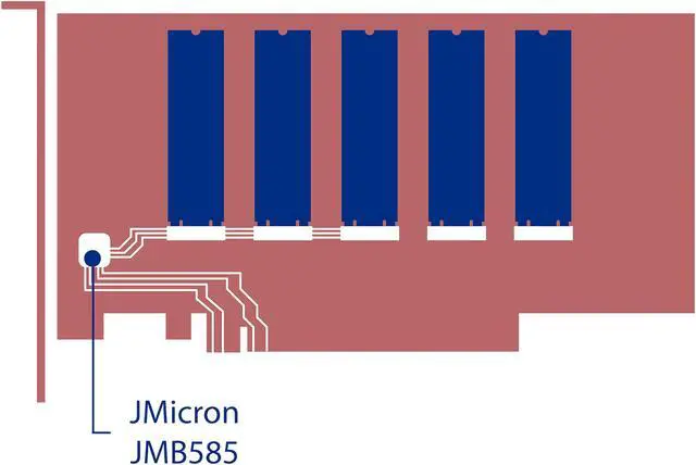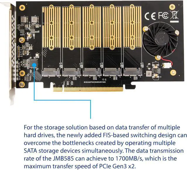 Using the JMB585 chipset, the SI-PEX40142 can provide PCIe Gen3 x2 bandwidth to 5 M.2 SATA Base B-key SSD solution. For the storage solution based on data transfer of multiple hard drives, the newly added FIS-based switching design can overcome the bottlenecks created by operating multiple SATA storage devices simultaneously. The data transmission rate of the JMB585 can achieve to 1700MB/s, which is the maximum transfer speed of PCIe Gen3 x2.