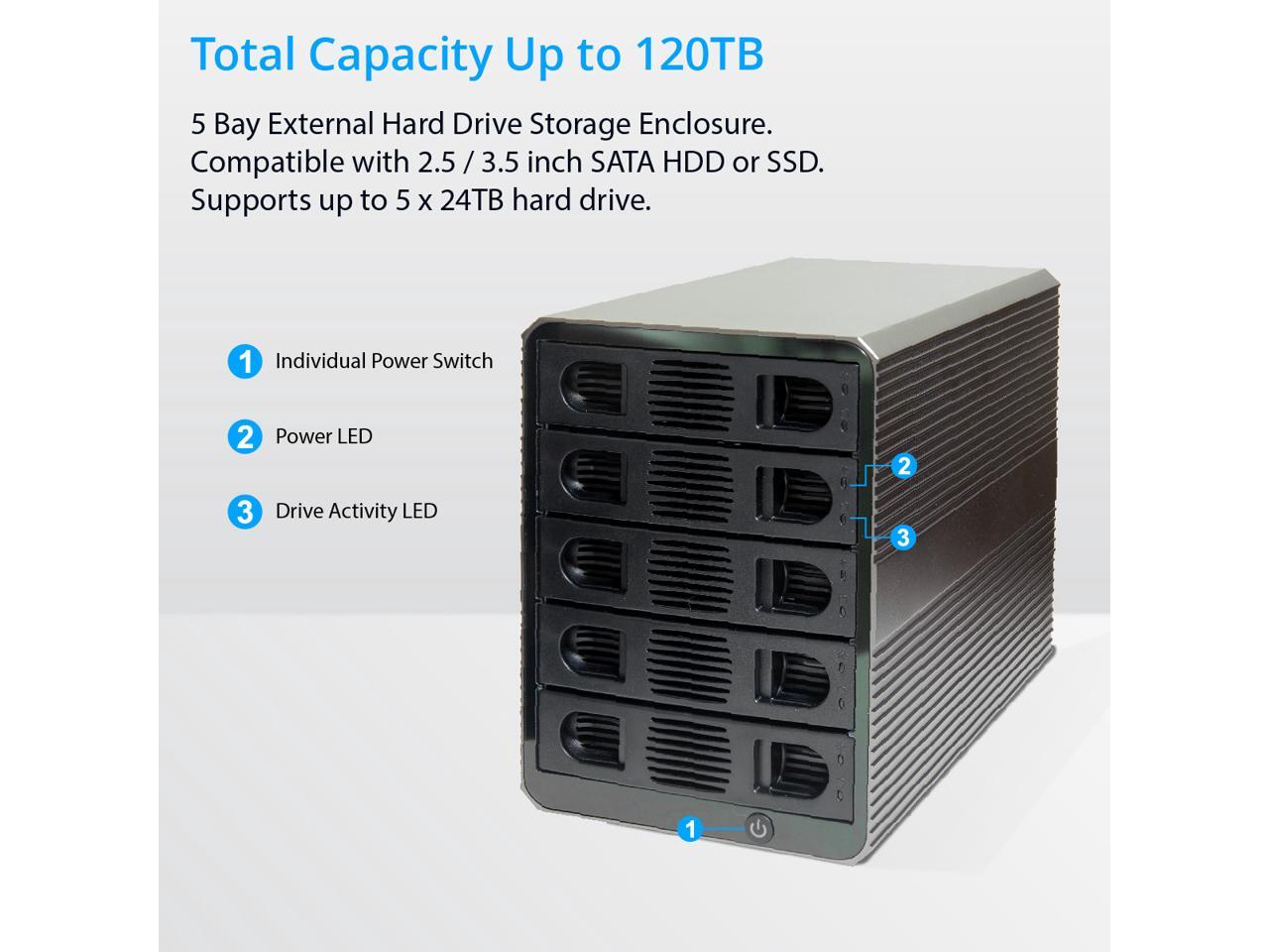 - Supports all brands of 2.5" and 3.5" SATA I/II/III hard disk drive up to 24TB per drive with a maximum support of 120TB.