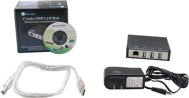 | Features | OS Support: Windows 7 Vista Windows XP Windows 2003 Windows 2000 Mac OS X (10.4/10.5/10.6/10.7) Linux (Kernel 2.6.9, 2.6.13, 2.6.14 to 2.6.38) Win CE Android Package Includes: Combo USB LAN Hub AC/DC Power Adapter (Cord Length: 5 feet, 5V, 2A) USB Cable Type-A Male to Type-B Male (47") Driver CD Screws |