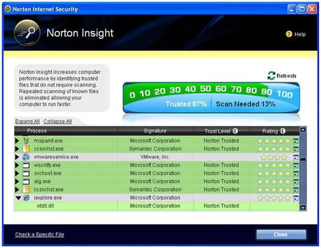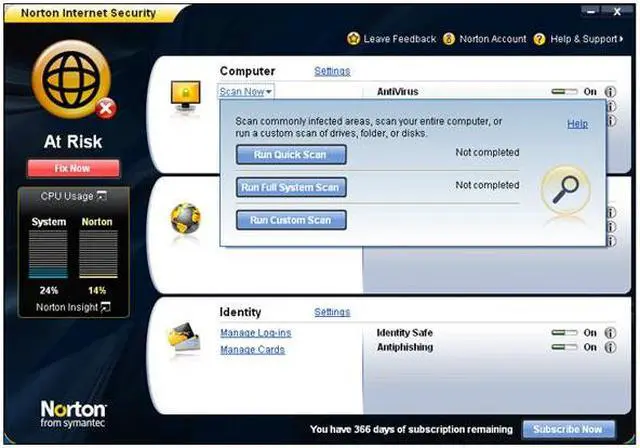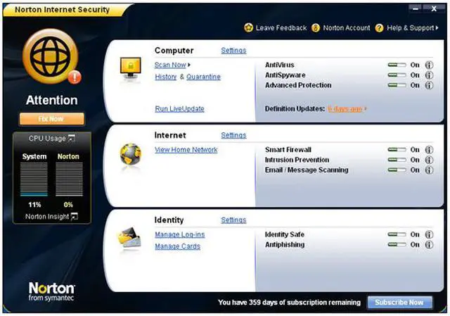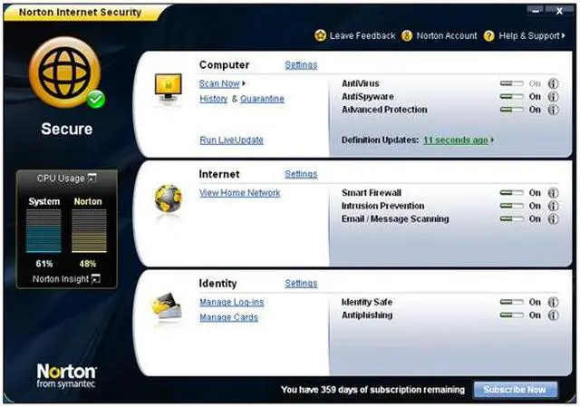 | Feature | Engineered for Speed Proven fastest, lightest security suite available. Intelligence-driven Norton Insight technology targets only those files at risk for faster, fewer, shorter scans Installs in under one minute on average requires less than 7 MB of memory. Up-to-the-minute Protection Delivers up-to-the-minute protection with rapid pulse updates every 5 to 15 minutes. The Norton Protection System provides multilayered protection technologies that work in concert to stop threats before they impact you. Real-time SONAR (Symantec Online Network for Advanced Response) helps prevent bots from taking control of your PC. Improved! Prevents threats from entering your firewall. Detects and automatically removes online threats. Automatically detects and removes spyware, viruses, Trojans, bots and Internet worms Boots and repairs badly infected PCs. Specialized deep-cleaning technology delivers our most complete scan possible to repair heavily infected computers. Norton Identity Safe Improved! Keeps your online identity safer than ever when you buy, bank, browse, and game online. Advanced phishing protection keeps your personal identification out of the hands of fraudulent Web sites. Stores and encrypts your passwords and other confidential data. Improved! Fills in online forms at your request to save time and protect you from keystroke loggers. Control without disruptions Puts every element of your security at your fingertips Schedules resource intensive tasks for when you’re not using your PC. Review the security status of every process on your PC. Silent mode suspends alerts and updates to avoid interrupting or slowing games and movies. Smart two-way firewall automatically makes security decisions for you. Secure Networking Improved! Helps you secure your home network. Conceals and secures your PC on public Wi-Fi networks. |