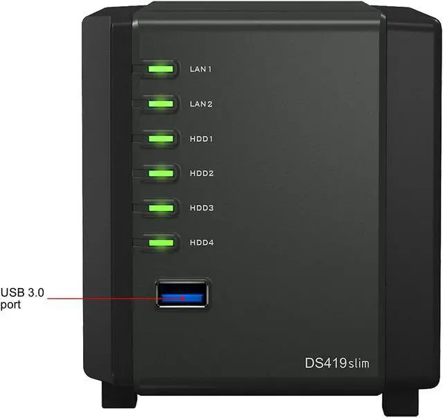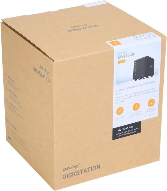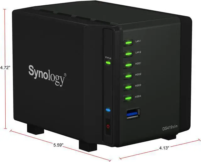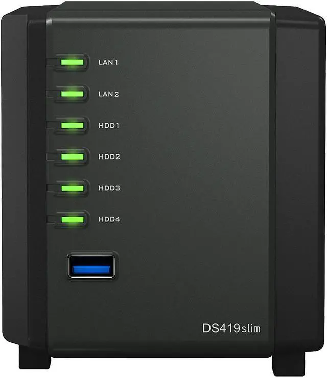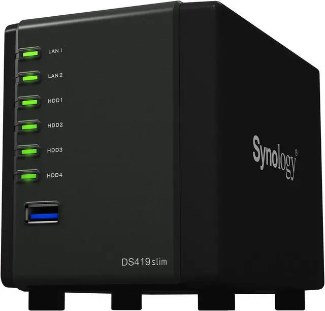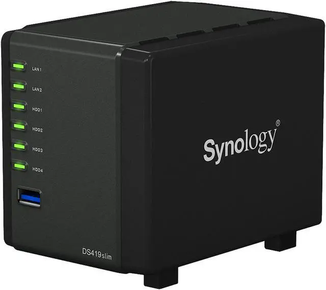 DS419slim is a four-bay cube-shaped NAS that supports four 2.5" drives with capacity up to 5 TB for each drive. This NAS provides a centralized place to store and manage your files, and offers you the ability to remotely access files, and stream multimedia content to your TVs and mobile devices. It's powered by dual-core processor, and runs on Synology DiskStation Manager (DSM) OS—a browser-based operating system which helps to simplify managing your Synology NAS. Two Gigabit Ethernet ports support failover and link aggregation. A 60 mm cooling fan is also included to keep your drives and entire NAS operating at peak performance.