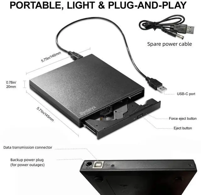 ![]() Synteryx External CD DVD Drive USB, Portable Slim CD/DVD +/-RW Burner Reader ... | ![]() Square matte black model with case | ![]() Thin brushed black model | ![]() Synteryx External CD DVD Drive USB 3.0 and Type-C, Portable Slim CD/DVD +/-RW... | ![]() Blu-ray CD burner | |