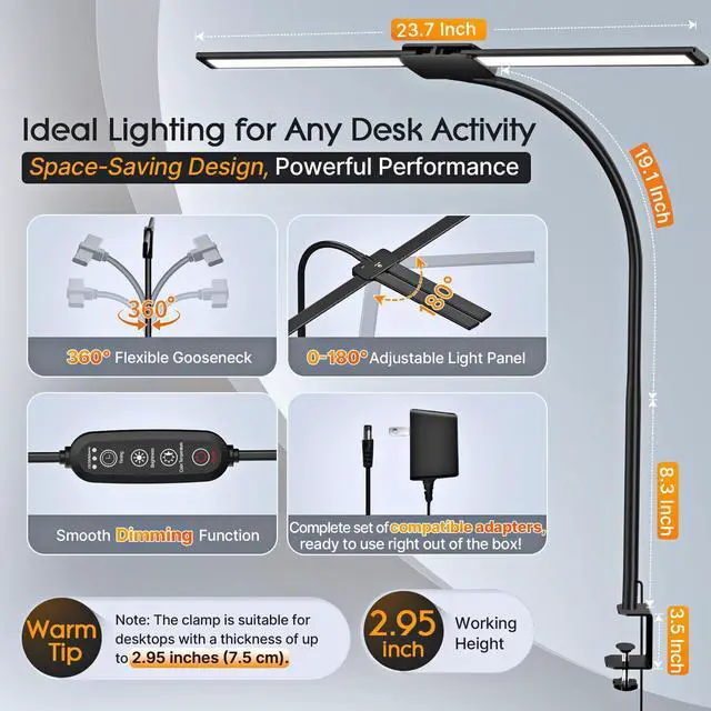 This office lamp is easy to install on desk by a rugged metal clamp, which supports a max 2.95 inches thickness of the desktop.