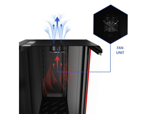 - Ventilation: Active – a cooling network rack fan preinstalled into the top, Passive – air flow circulation due to perforated front door