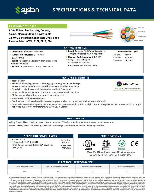 • Applications: Wiring Fire Alarm, Security Burglar Alarm, Public Address Systems, Intercoms, Telephone Stations, Communications, Instrumentation, Access Control, Nurse Call, Security and Other Low Voltage Circuits that are Power-Limited Applications.