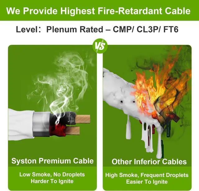 • CMP (Plenum-Rated): Our cable is designed with your safety in mind. It features a CMP/CL3P/FPLP (Plenum-Rated) flame-retardant rating that provides peace of mind in case of fire.