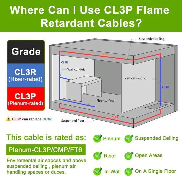 CMP (Plenum-Rated): Our cable is designed with your safety in mind. It features a CMP/CL3P/FPLP (Plenum-Rated) flame-retardant rating that provides peace of mind in case of fire.