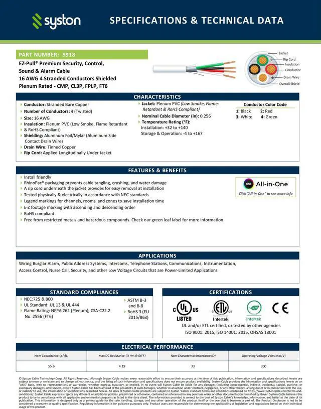 • Applications: Wiring Fire Alarm, Security Burglar Alarm, Public Address Systems, Intercoms, Telephone Stations, Communications, Instrumentation, Access Control, Nurse Call, Security and Other Low Voltage Circuits that are Power-Limited Applications.