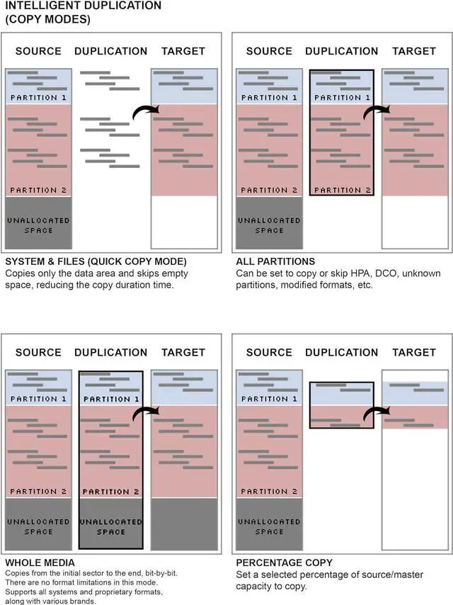 Copies from the initial sector to the end, bit-by-bit. There are no format limitations in this mode. Supports all systems and proprietary formats, along with various brands.