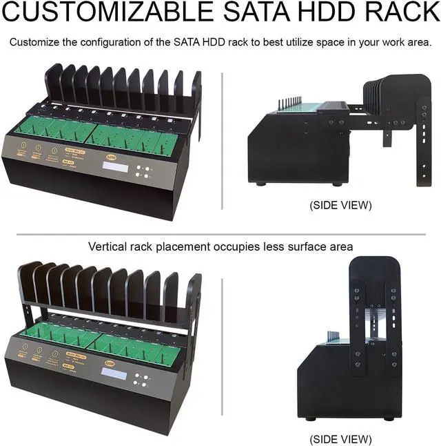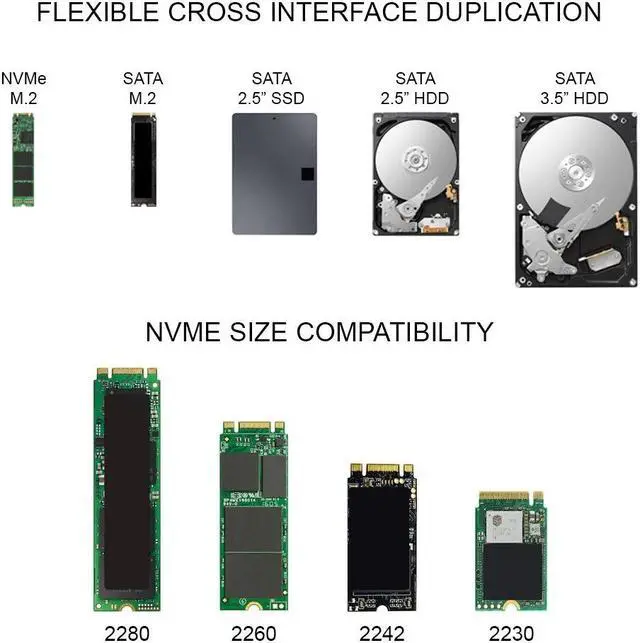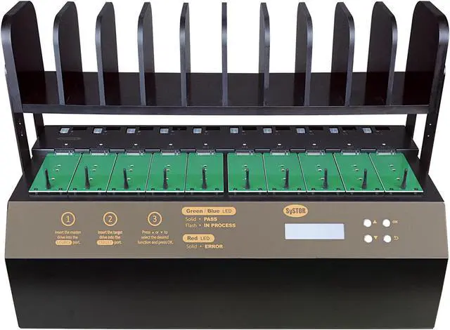 Systor M.2 NVMe PCIe/SATA SSD/HDD duplicators are completely standalone units that can clone or sanitize a number of different media types. Easily insert and copy (or erase) M.2 or SATA solid state SSD drives or HDD hard disk drives with a single touch of a button. These duplicators consistently perform copy sessions with no speed degradation even when the number of target devices increase. Various copying and erasing modes help in managing different task requirements for duplicating and wiping your storage media.These high-speed, high-performance M2 copiers are the perfect solution for business (small to enterprise), education, and government entities (military, law enforcement, etc.) where copying and erasing device data needs to be accomplished with precision and minimal time.