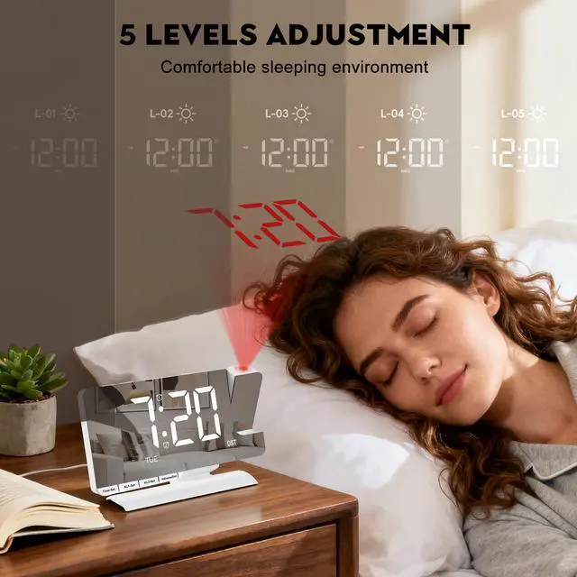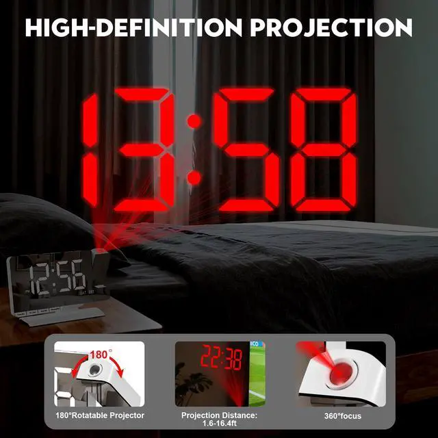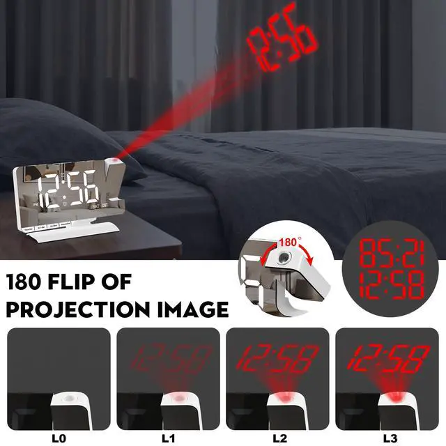 Projection Alarm ClockSZELAM projector of the alarm clock can be rotated 180° to flip the time display. The projection distance is 5 m/16.4 feet (best 2-3 m), 4 levels of projection brightness adjustment, which can project the time clearly at the best position on the wall or ceiling so that you can watch the time comfortably. Ideal for children, boys, girls and children's rooms.