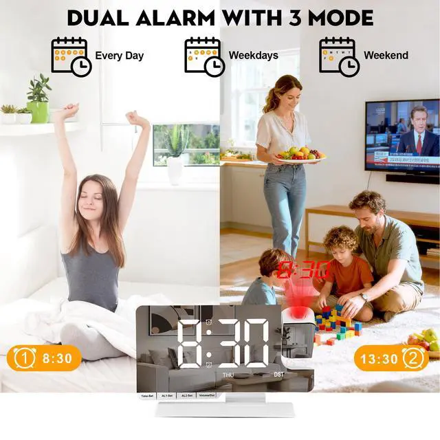 Digital Clock,Alarm Clock Bedside with Projection,7.3" Mirror Clock with 180°Rotating Projector,Dual Alarm with 3 Mode,Brightnee Adjust,DST,Snooze,Charging Port,5 Levels Volume for Desk Teens