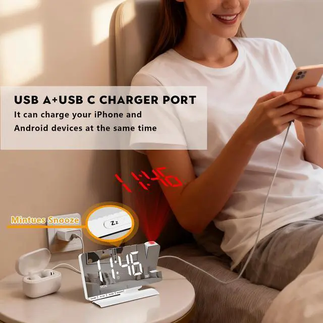 Large Display Projection Alarm ClockThe digital desk clock is equipped with a 7.3 HD LED display and large digital fonts and is visible from at least 20 feet away during the day and night. The large size of the digits is a blessing for visually impaired people. You can change the display numbers in different colors and there is a dimmer to adjust the brightness of the screen. The modern clock has a unique acrylic mirror surface