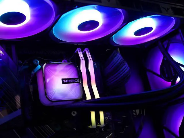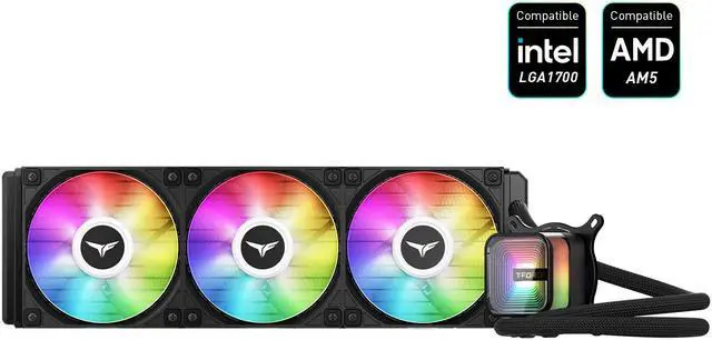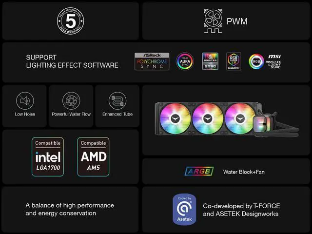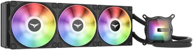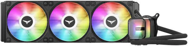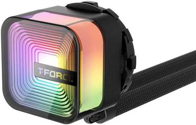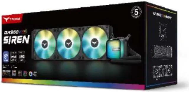T-FORCE SIREN GA360 ARGB All-in-One Liquid Cooler, showcasing captivating aurora effects and seamless compatibility with ASUS Aura Sync, ASROCK-Polychrome Sync, BIOSTAR Advanced VIVID LED DJ, GIGABYTE RGB Fusion 2.0, and MSI Mystic Light Sync.