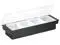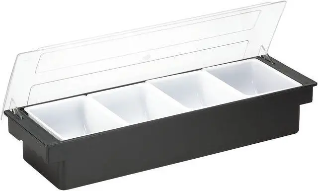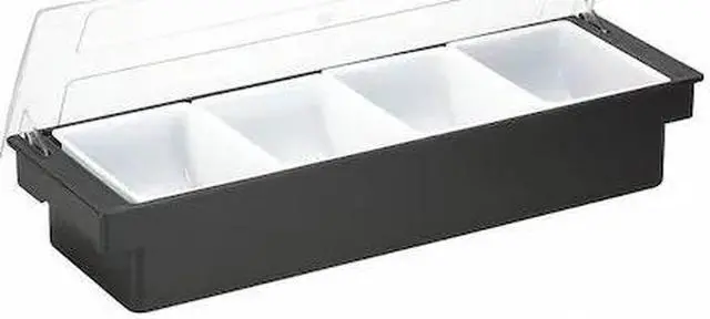 Condiment Holder, Material Plastic, Overall Depth 6 1/8 in, Number of Compartments 4, Overall Height 4 3/8 in, Overall Width 19 1/2 in, Handle No, Includes (4) 1.5 Pint White Hard Plastic Inserts, Product Type Condiment Bar, Capacity 3 qt, Card/Signholder No, Lid Included Yes, NSF Certified No, Overall Diameter Not Applicable. This item has been restricted from sale in the following state (s): []