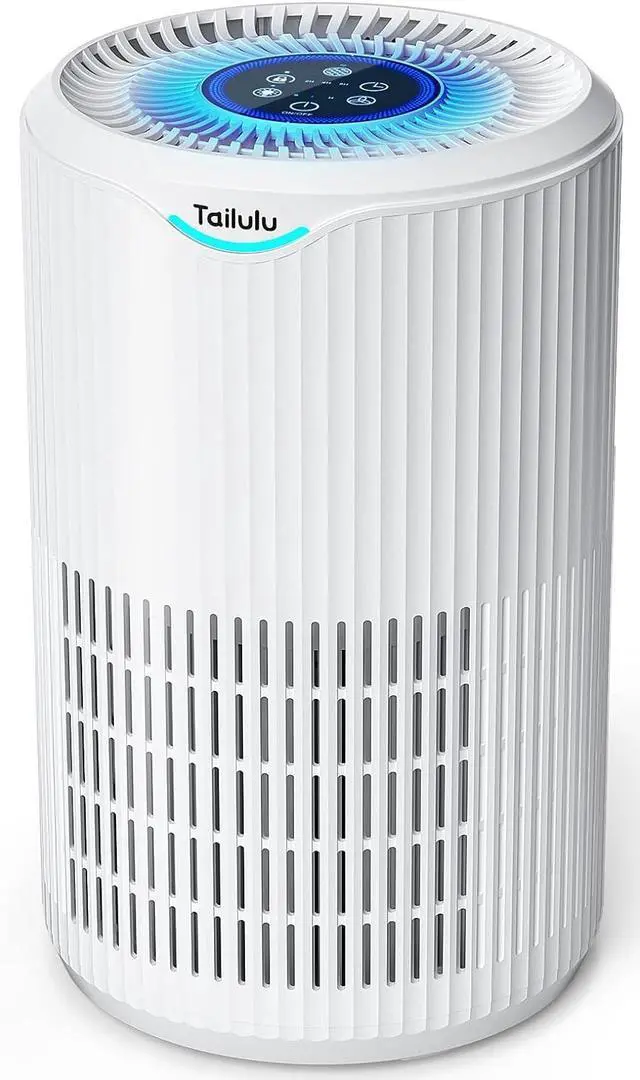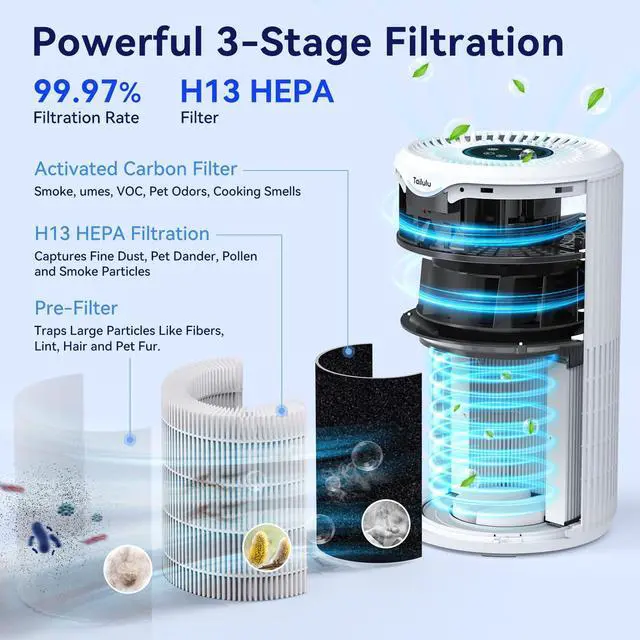 [HIGH-PERFORMANCE 3-STAGE FILTER] Tailulu H13 True HEPA air purifiers adopt a 3-stage filtration system, including a pre-filter, H13 true HEPA filter, and charcoal filtration, which purify air particles as small as 0.3 microns such as smoke, pet hair, dust, pollen, cooking smell.