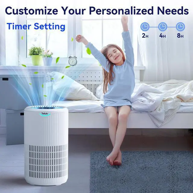 [TIMER SETTING, 3 FAN MODES & FILTER REPLACEMENT REMINDER] 3 timer options (2H/4H/8H) allow you to customize the timer of the room purification time. Our HEPA filter air purifiers have 3 wind modes to meet your needs: high, low, and sleep mode. The smart filter indicator light will auto-on to remind you its time for a new filter. We recommend you replace the filter every 3-6 months depending on the environment and usage frequency. (Search B0BFX15HBS to find the Tailulu D09 replacement filter.)