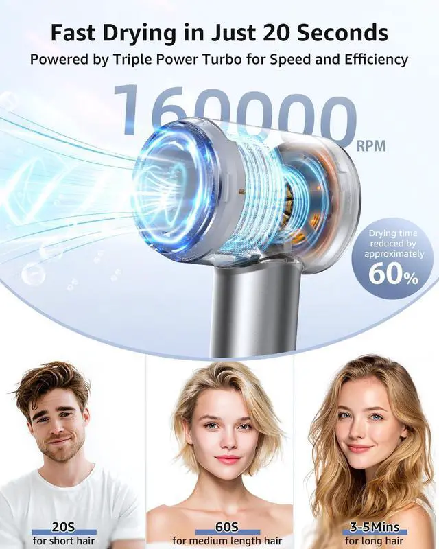 Ultra-Fast Drying: Powered by a 160,000 RPM brushless motor, this ionic hair dryer delivers a strong airflow of up to 36 m/s, drying your hair 5x faster than traditional blow dryers. 1-2minutes for men's short hair, 2-3 minutes for general long hair, 4-5 minutes dry thick long hair. Whether you're in a rush or styling thick hair, it helps achieve smooth, shiny results in record time