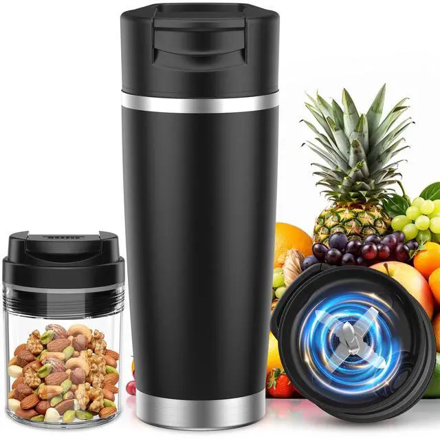 includes a stainless steel insulated blender cup and a food-grade Tritan snack storage cup (heat-resistant, non-stainless steel)