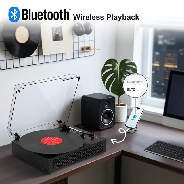 Bluetooth Record PlayersEnjoy smooth, wireless streaming with Bluetooth 5.1 technology. You can connect your smartphone or tablet to play streamed digital music or play vinyl records through the built-in speakers. Perfect for whom love vinyl and want to easily listen to it wirelessly.
