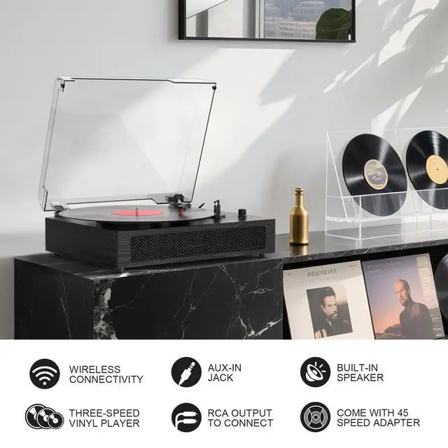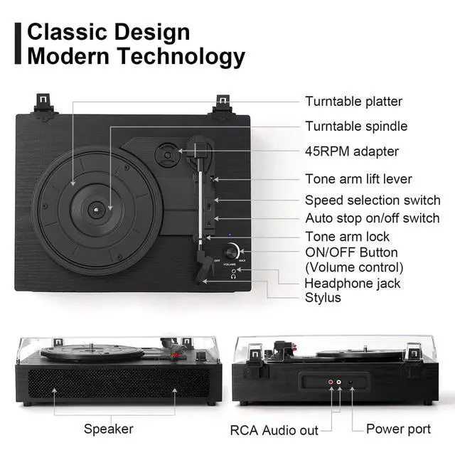 All-in-One TurntableGet high-quality sound from the built-in stereo speakers. Connect via Bluetooth, AUX-in or RCA cable to expand your experience. Switch between vinyl playback and wireless streaming with ease. This turntable stops playing automatically.