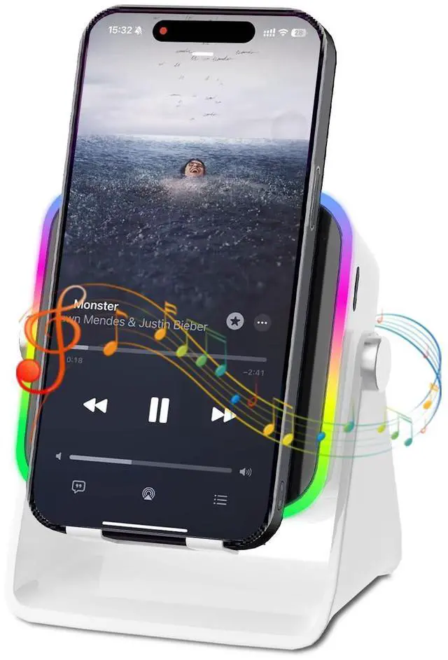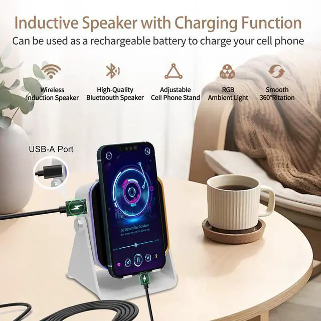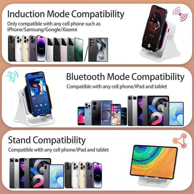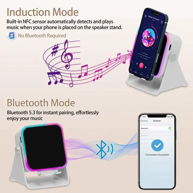 Dual Play Modes: Induction & BluetoothThis all-in-one device works as both a wireless induction bluetooth speaker and a standalone induction speakerno complicated setup needed! As a wireless induction speaker, just place your phone on the stand (compatible with iPhones as an induction speaker for iPhone and Android devices as an induction speaker for android) to play music, podcasts, or videos instantlyno Bluetooth pairing required. Switch to Bluetooth mode (equipped with advanced Bluetooth 5.3) for a 10-meter stable connection