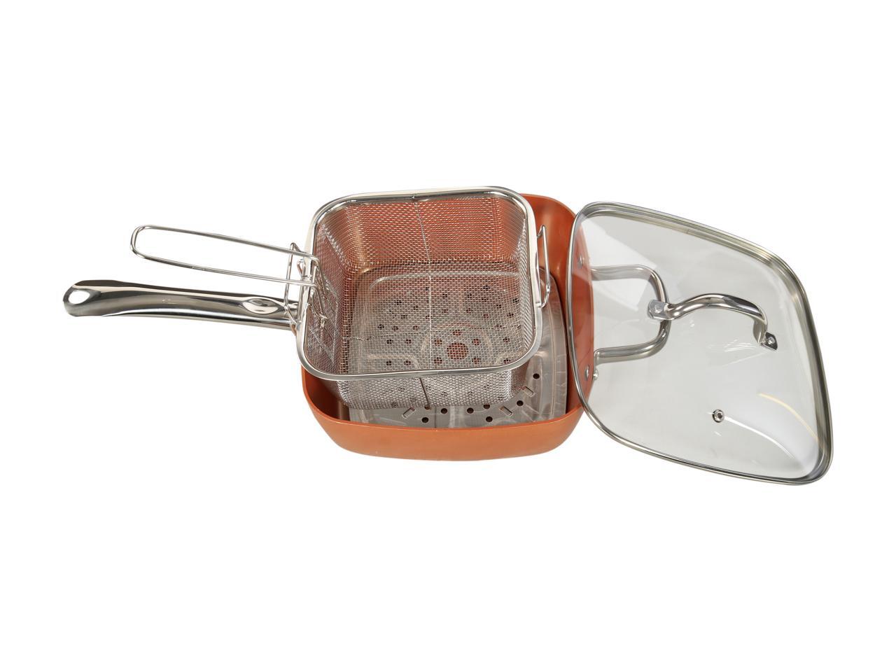 - Set includes Pan size- 9 1/2 inches- 4.5 Quarts, Glass Lid, Fry Basket, and Steam Rack
