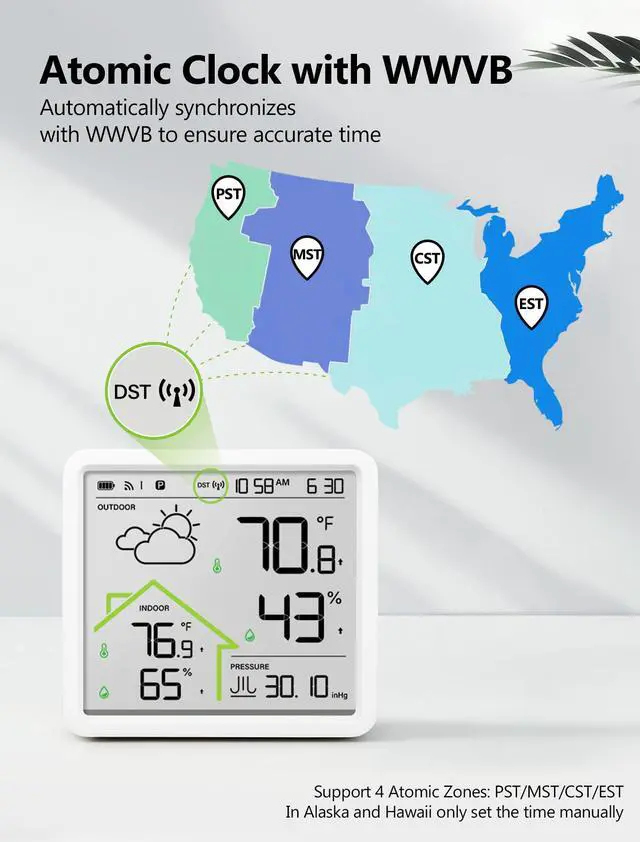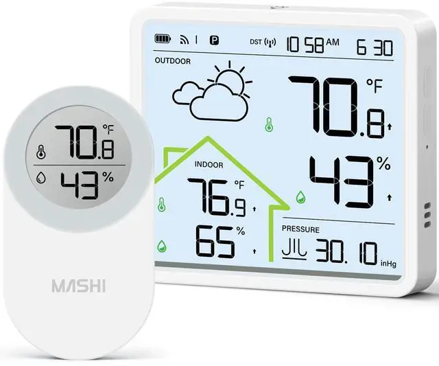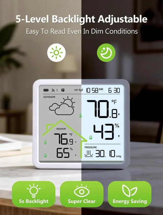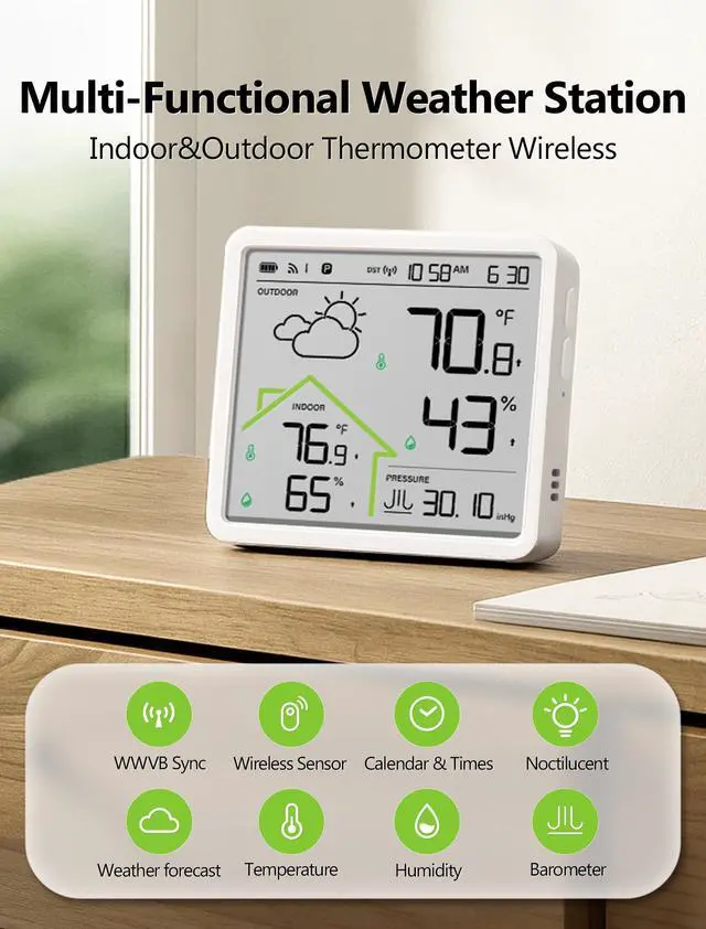 Multifunctional Weather StationEquipped with a 4.3-inch full-color HD display, clear digits, Easy to read even from several meters away, ideal for seniors. Displays indoor/outdoor temperature & humidity (°C/°F), weather forecast, time/date (12/24H), barometric pressure, and atomic clock