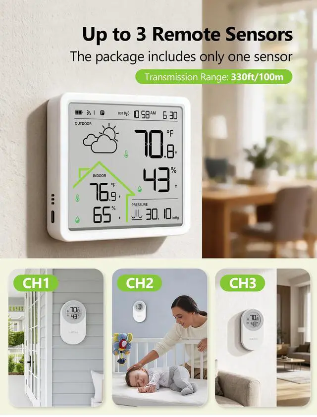 Indoor Outdoor Thermometer Wireless:Connect up to 3 remote sensors (1 included) with a transmission range up to 330ft/100m in open areas. Monitor temperature and humidity in different locations such as baby room, storage, garden, greenhouse, garage, or other areas for accurate readings at a glance