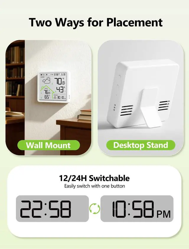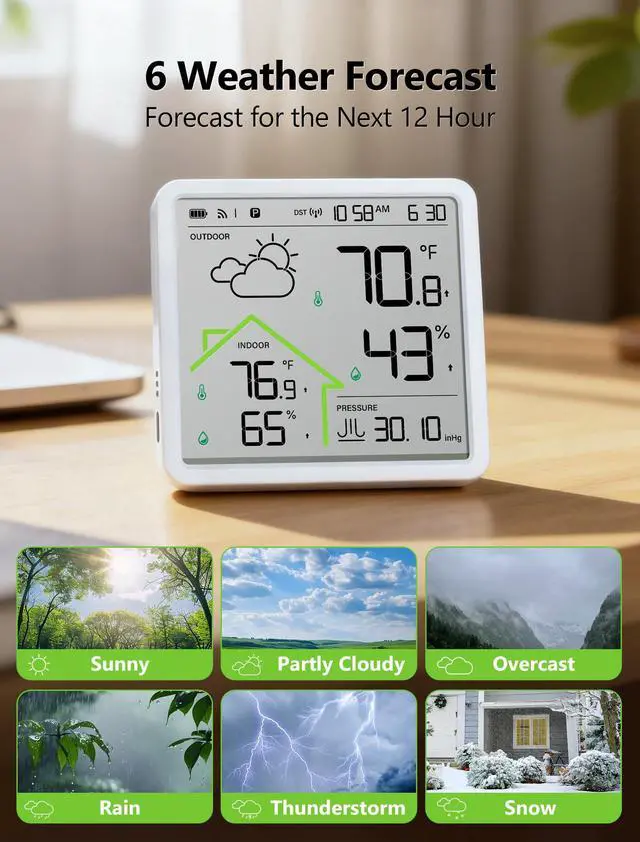 Accurate Weather ForecastAdvanced technology calculates the weather forecast for the next 1224 hours based on temperature, humidity, and barometric pressure data. Calibrated over 710 days for higher accuracy. 6 dynamic icons (sunny, partly cloudy, cloudy, rainy, heavy rain, snowy) provide intuitive weather updates, helping you plan outdoor activities in advance
