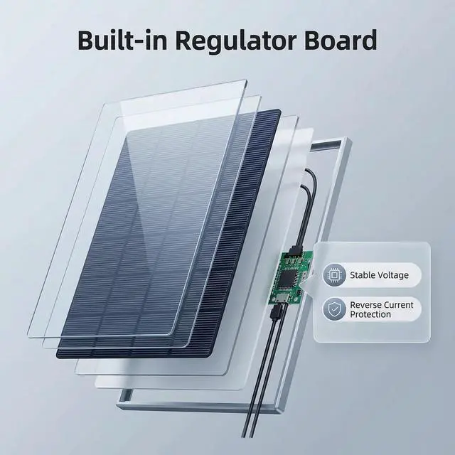 Continuous Solar Power & Advanced Safety ChipEquipped with a built-in voltage stabilization & protection board, this solar panel efficiently converts sunlight to power while intelligently preventing reverse current discharge at night. It safeguards your expensive security camera and bird feeder camera or trail camera's battery from overcharging and short-circuits, ensuring 24/7 operation with complete peace of mind.