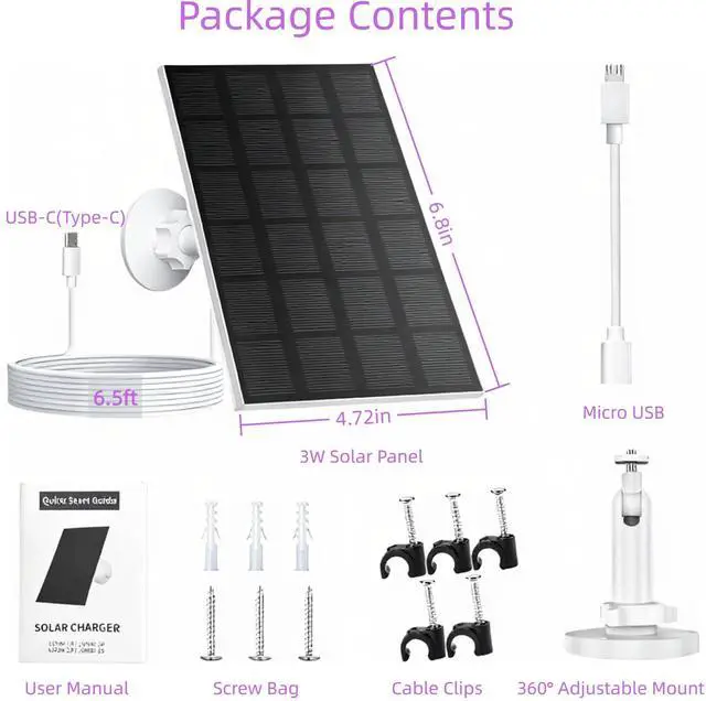 Complete with all accessories & Easy to Install1 x Solar panel with 6.5-inch Type-C cable,1 x Mounting bracket with 360° rotating base and 90° adjustable tilt,1 x Micro USB adapter cable, 1 x Instruction manual, 3 x Mounting screws, 5 x Cable tie clips.