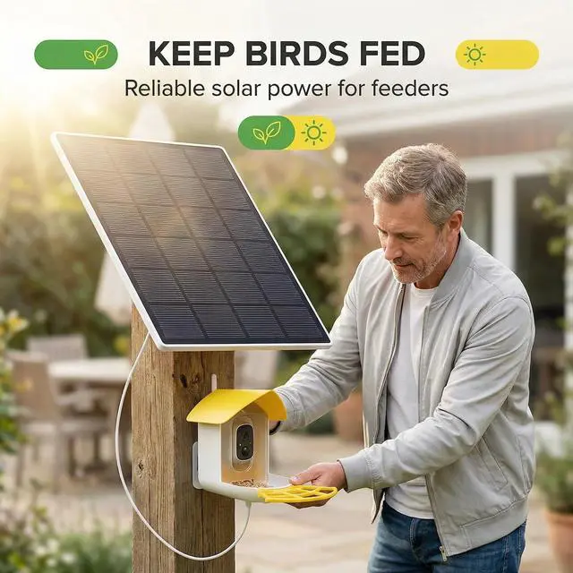 Solar Panel for Bird Feeder CameraSuitable for outdoor bird feeder cameras equipped with rechargeable batteries, this charger powers bird feeder cameras featuring micro SUB or USB-C ports, ensuring continuous operation.