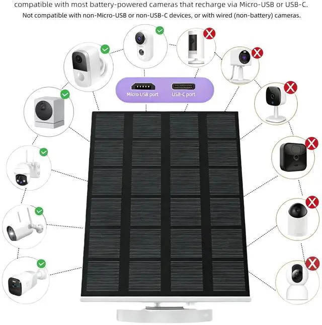 Solar Panel for Security CameraDelivering a stable 5V/3W output for rechargeable battery security cameras featuring a micro USB or USB-C port. The solar panel is not compatible with Arlo, Blink, Ring, Eufy, Google Nest, Kasa cameras, or any plug-in camera without a battery.
