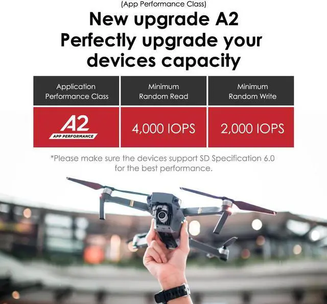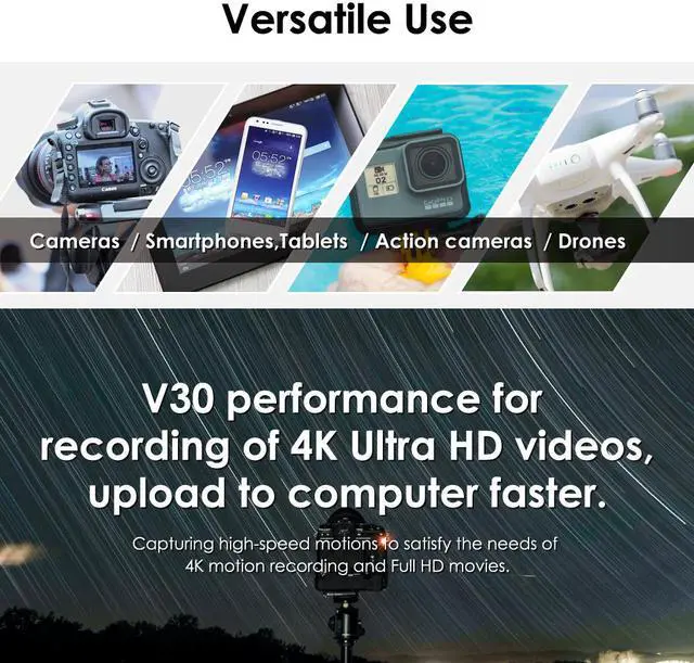 ?The Advanced Performance You Will Get : The advanced UHS-1 A2 U3 V30 interface with read speed up to 100MB/s and wtite speed up to 85MB/s, can record Full HD videos and 4K video, get the meories quicker and transfer the files faster. (Performance May Vary Based on Host Device, Interface, Usage Conditions, and Other Factors)