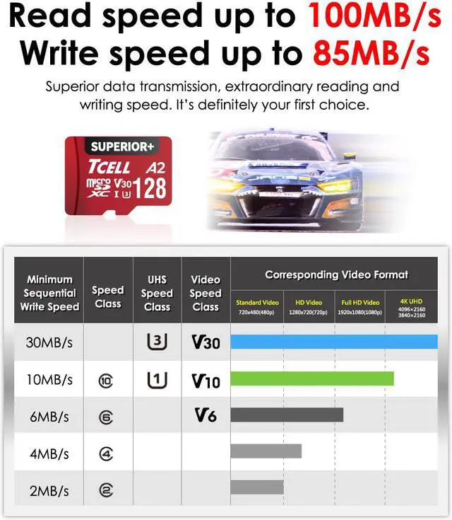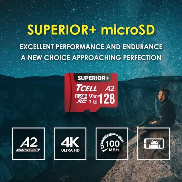 • TCELL Superior+ memory cards are high compatibility for different types of devices including smartphones, tablets, Drones, Android Tablets, Tablet PCs, Action Cameras, DSLR and 4K or Full HD camcorder. Supports A2 app performance class, expedite your workflow with faster application performance. The speeds may vary subject to different interface conditions, Read : up to 100MB/s ; Write : up to 85MB/s. 5-year limited manufacturer warranty.