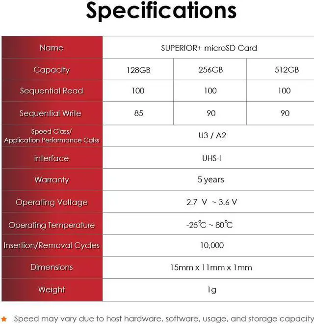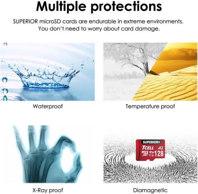 ?Multiple Protections : Waterproof, Temperature Proof, X-Ray Proof, Diamagnetic, Shock and Vibration Proof. Superior+ microSD cards are endurable in extreme environments. You don’t need to worry about card damage.