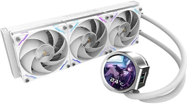 The TCOMAS LX800 360 AIO Liquid CPU Cooler redefines visual interaction and cooling performance. Featuring a revolutionary dual-display cold head a 2.8-inch IPS round screen paired with a 1.44-inch LCD side display it provides comprehensive real-time monitoring and full customization through the TCOMAS control software.