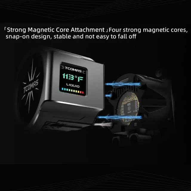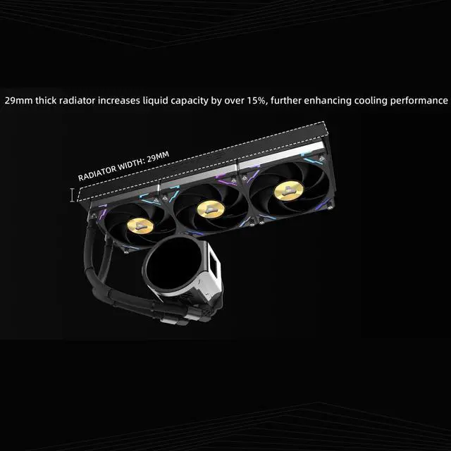A built-in 5015 fan enhances VRM and RAM cooling, while the CNC-machined aluminum alloy shell blends durability with futuristic design. The magnetic cold head attachment ensures effortless installation, and the 29mm radiator increases liquid volume by over 15%, boosting heat dissipation efficiency.