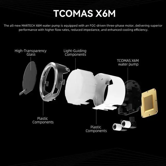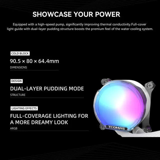 The TCOMAS LE100 360 ARGB Liquid CPU Cooler delivers the perfect balance of power, silence, and style. Featuring the next-gen MARTECH X6M water pump with an FOC-driven three-phase motor, the LE100 ensures superior coolant circulation and minimal vibration. Its dual-layer pudding light design produces a full-coverage ARGB glow for a dreamy visual experience.