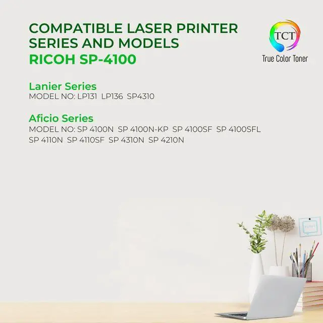 TCT offers quality Ricoh SP-4100 402809 compatible replacement cartridges that fit effortlessly into your printer. You will find crisp, clear prints with consistently dark tones and sharp images in every single print job. Get professional quality prints every time and save a bundle with True Color Toners high quality printing supplies!
