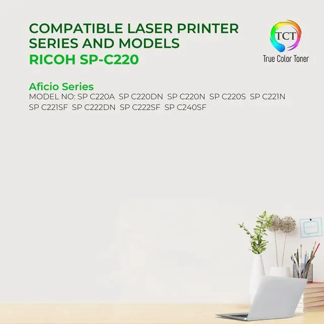 TCT offers quality Ricoh SP-C220 406044 compatible replacement cartridges that fit effortlessly into your printer. You will find crisp, clear prints with consistently dark tones and sharp images in every single print job. Get professional quality prints every time and save a bundle with True Color Toners high quality printing supplies!