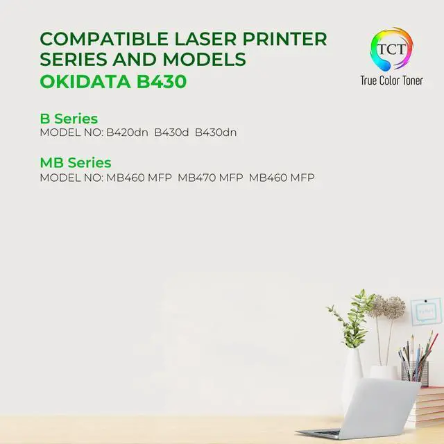 TCT offers quality Okidata B430 43979201 compatible replacement cartridges that fit effortlessly into your printer. You will find crisp, clear prints with consistently dark tones and sharp images in every single print job. Get professional quality prints every time and save a bundle with True Color Toners high quality printing supplies!
