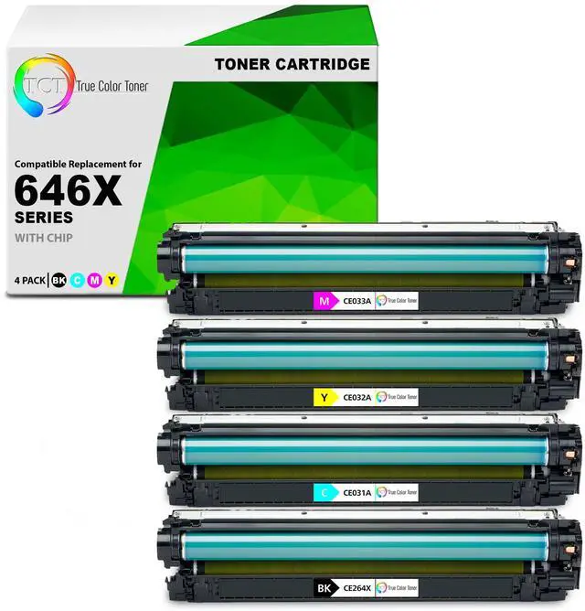 TCT offers quality HP 646X CE264X CF031A CF032A CF033A High Yield compatible replacement cartridges that fit effortlessly into your printer. You will find crisp, clear prints with consistently dark tones and sharp images in every single print job. Get professional quality prints every time and save a bundle with True Color Toners high quality printing supplies!