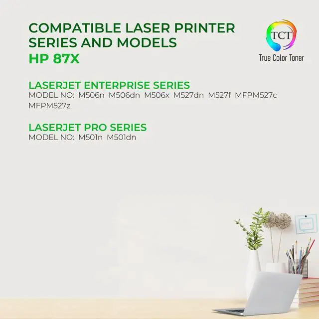 TCT offers quality HP 87X CF287X High Yield compatible replacement cartridges that fit effortlessly into your printer. You will find crisp, clear prints with consistently dark tones and sharp images in every single print job. Get professional quality prints every time and save a bundle with True Color Toners high quality printing supplies!