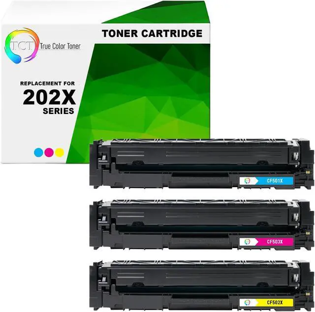 TCT offers quality 202X CF501X CF502X CF503X High Yield compatible replacement cartridges that fit effortlessly into your printer. You will find crisp, clear prints with consistently dark tones and sharp images in every single print job. Get professional quality prints every time and save a bundle with True Color Toners high quality printing supplies!